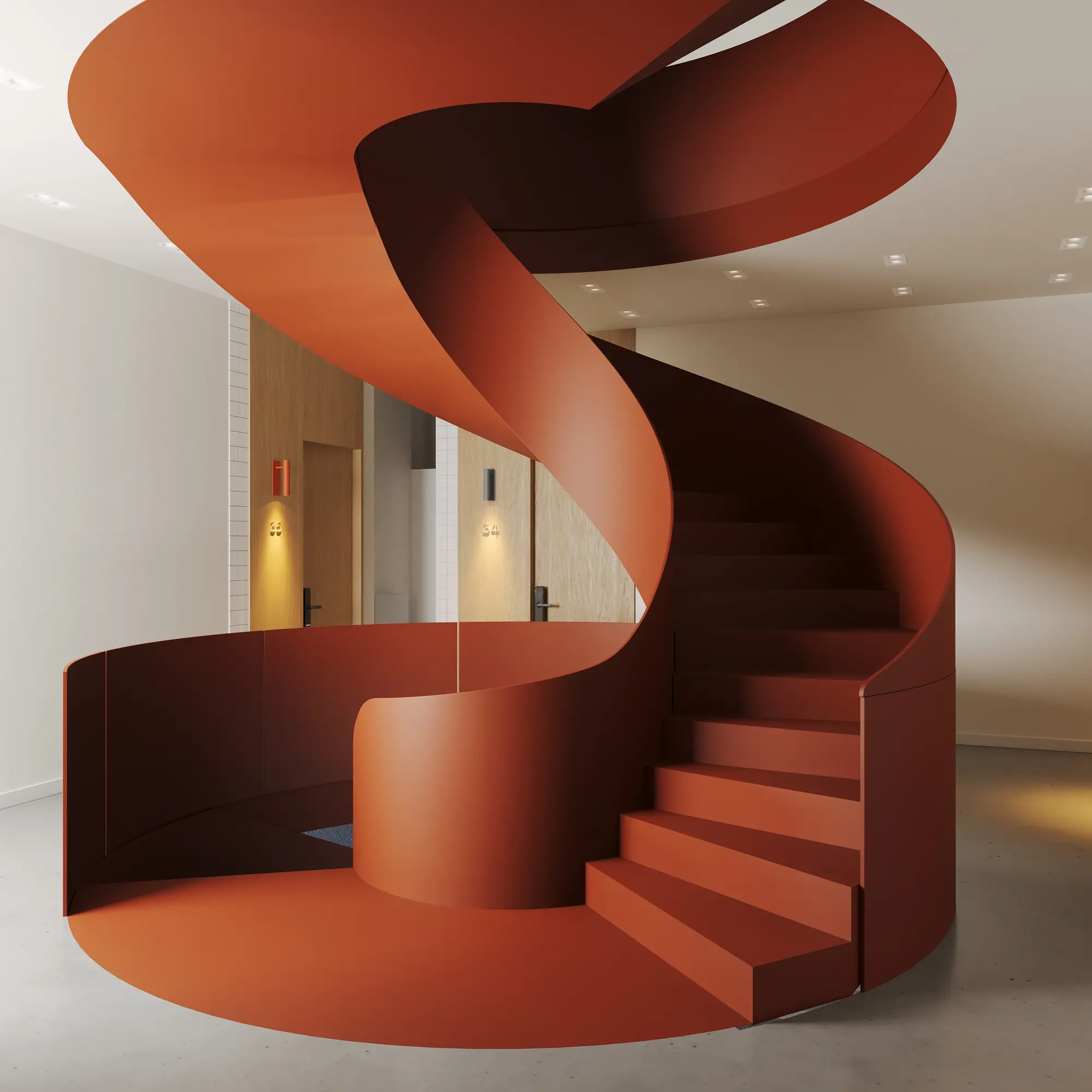 The project includes guest rooms across several categories, as well as a public restaurant, co-working and conference areas, a shared kitchen, and informal lounges. These spaces are conceived as extensions of one another — connected through continuity of material and transitions of light, rather than rigid functional boundaries.