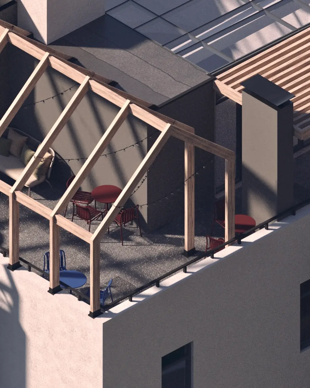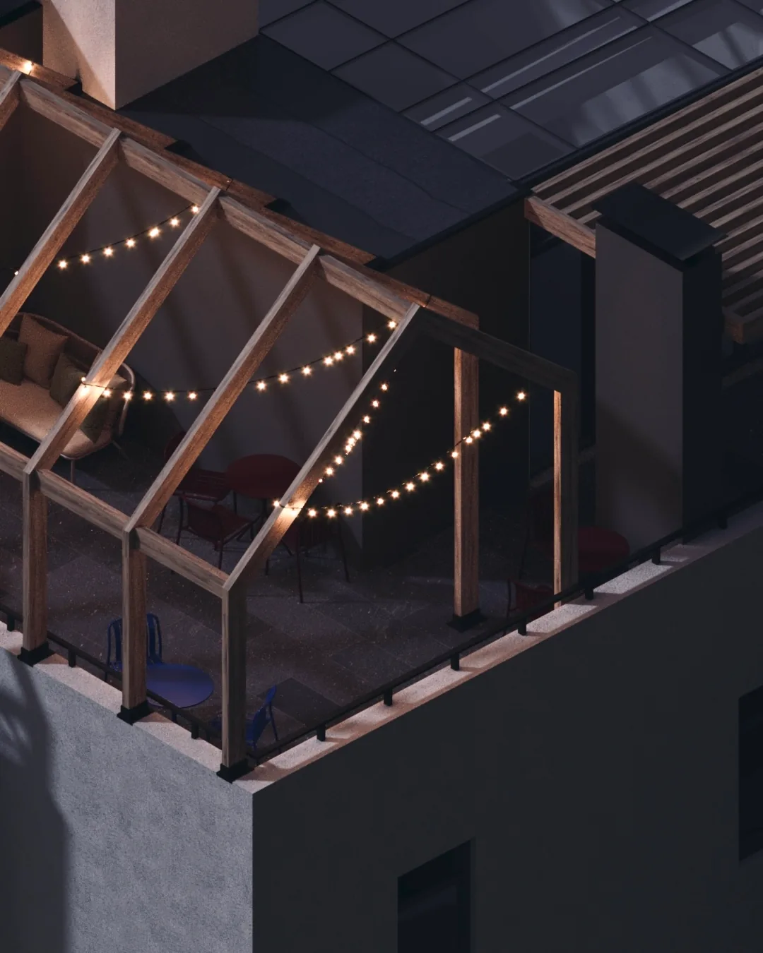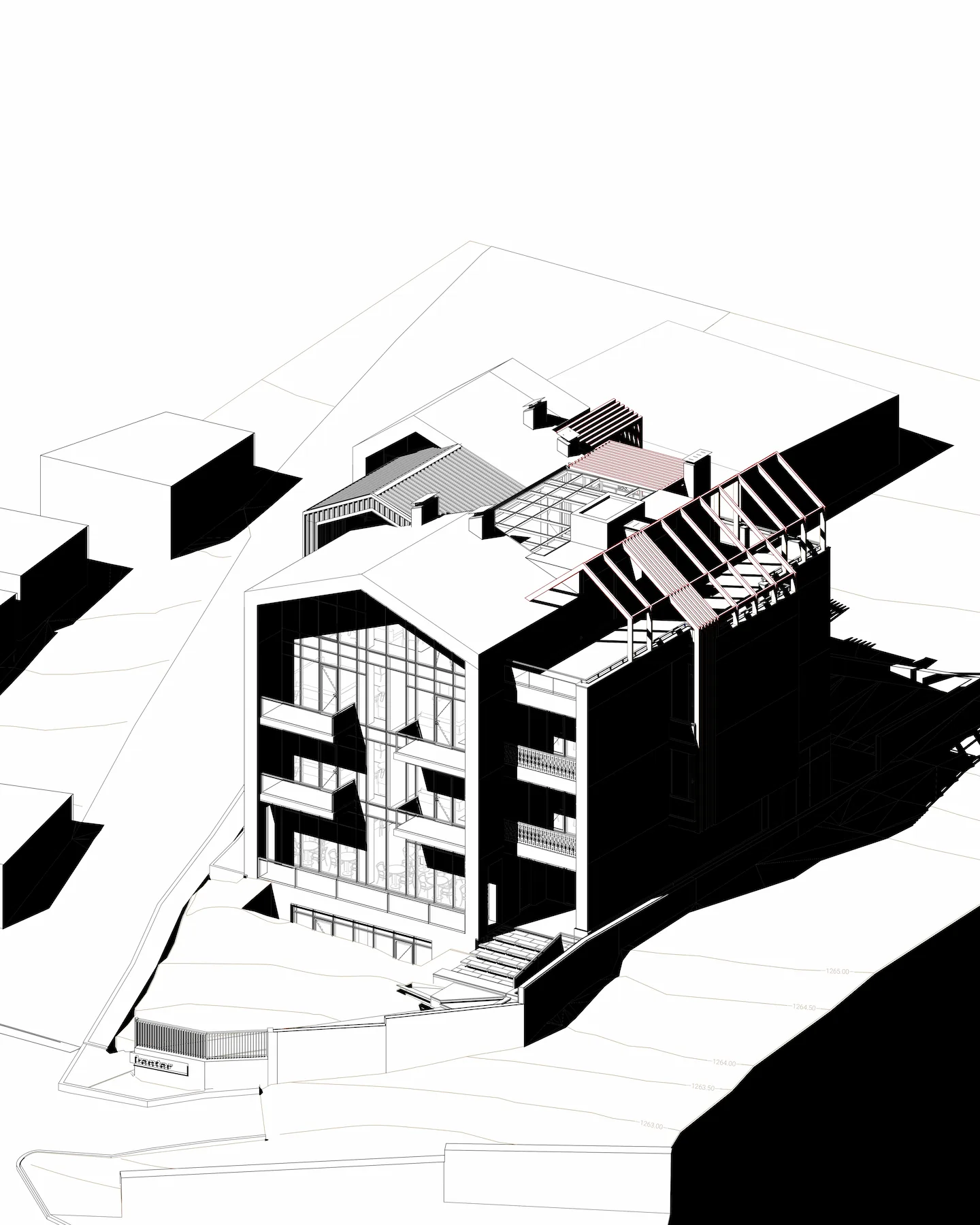 The first level is fully open to the public, structured around a central restaurant that invites both local visitors and hotel guests. Below, the sunlit ground floor is reserved for hotel guests and includes co-working areas, a shared kitchen, a flexible common room, and a compact conference space. These zones are defined not through solid separations but through material, transparency, and shifting ceiling heights — allowing for openness while maintaining spatial clarity.