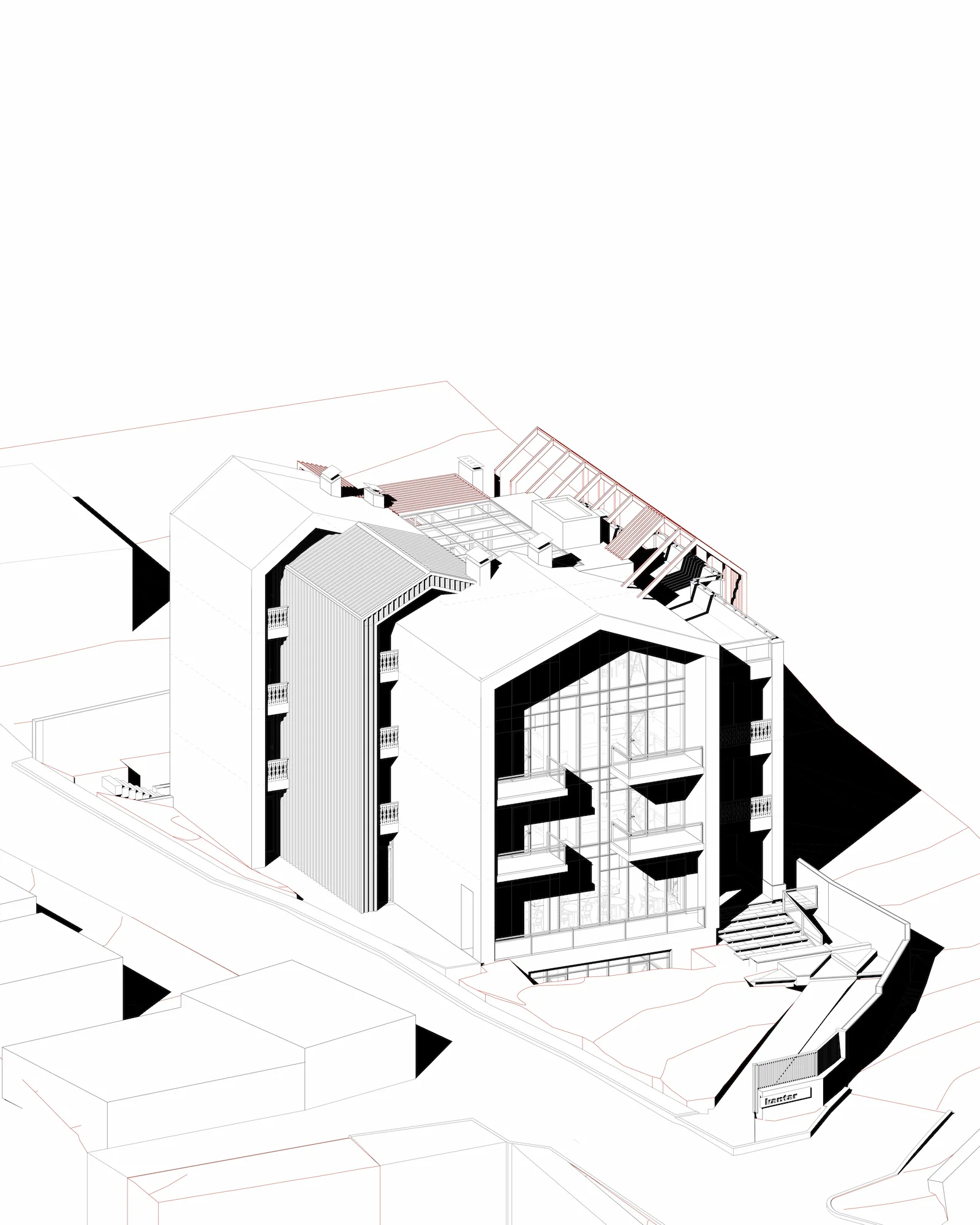 The architectural intervention avoids formal gestures and instead focuses on spatial logic, daylight access, and functional layering. Circulation routes are clean and legible; transitions between public and private zones are calibrated to allow both intimacy and informal social contact.