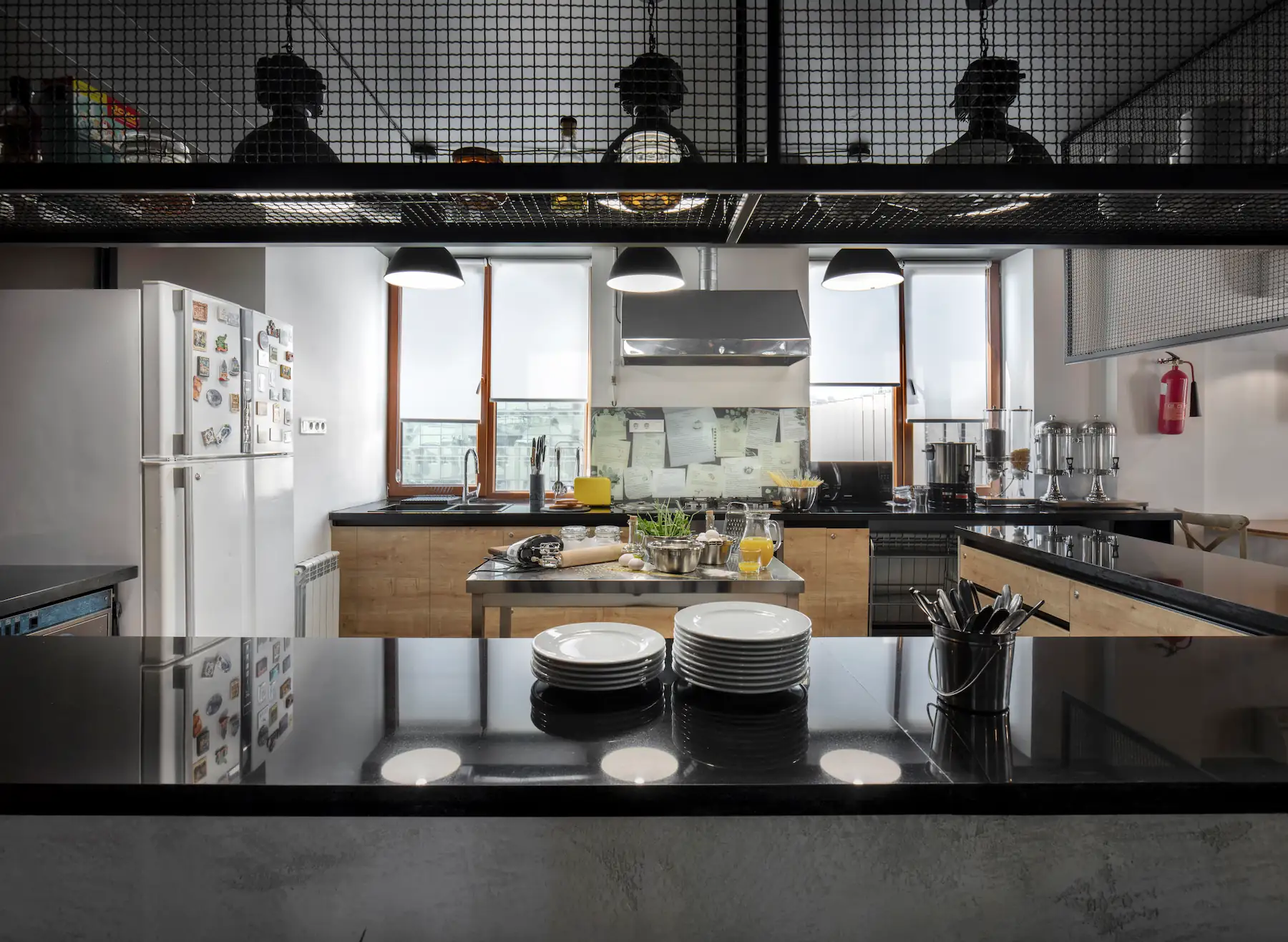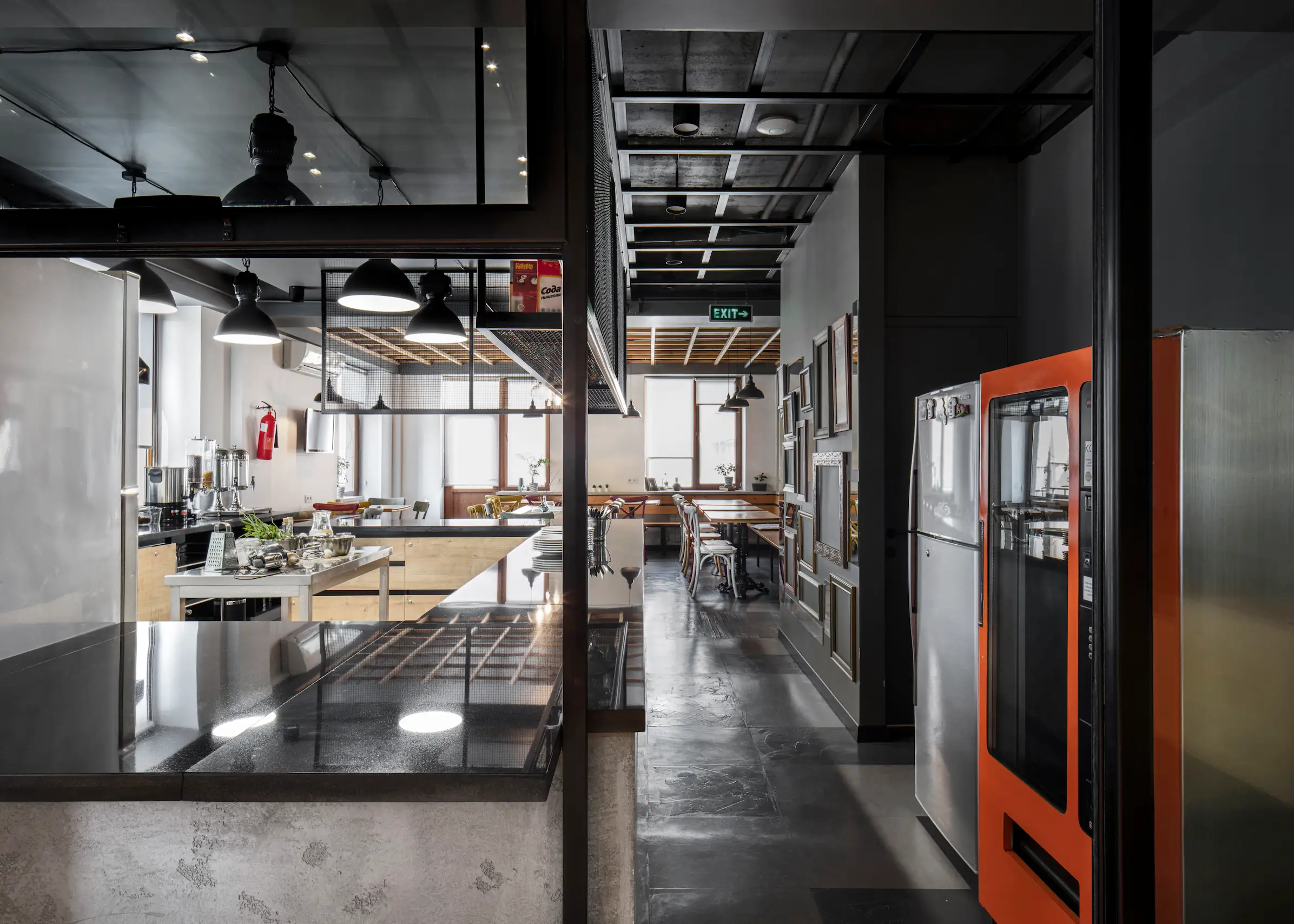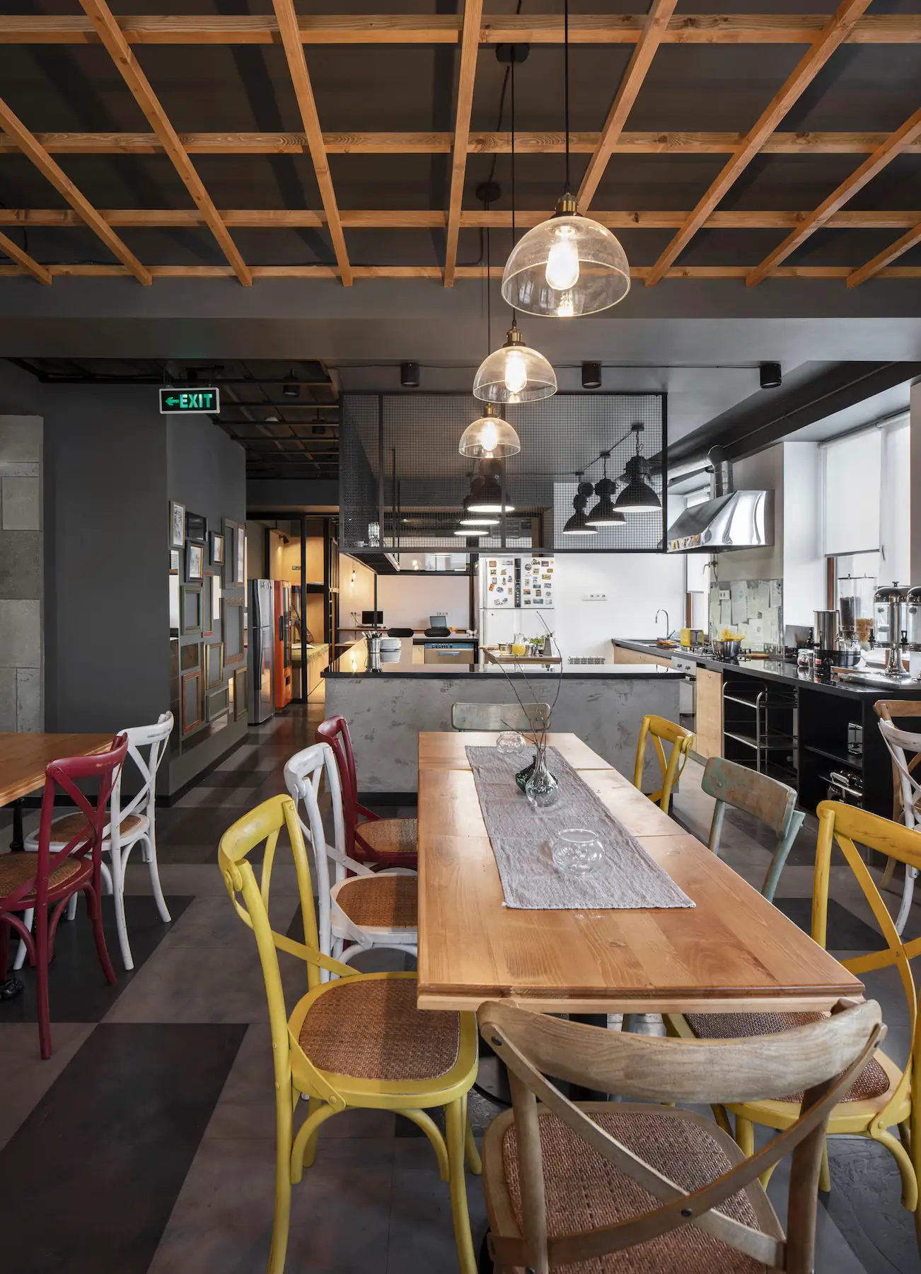 A key intervention was the reconfiguration of the first-floor layout. The original plan segmented the common spaces into small, isolated rooms, limiting guest interaction. To address this, we introduced an open-plan concept with a central shared kitchen, surrounded by a breakfast area and a flexible common room that doubles as a quiet study space. Glass partitions provide subtle division without sacrificing openness or light, fostering both socializing and privacy as needed.