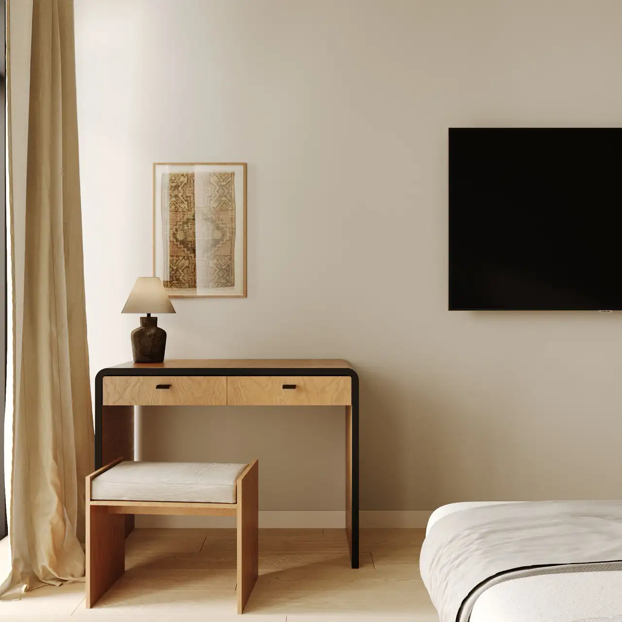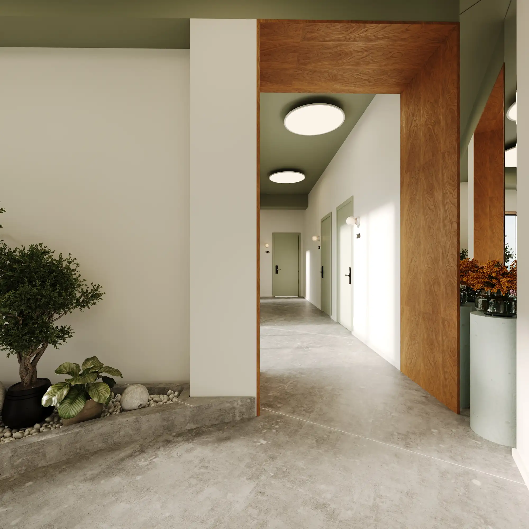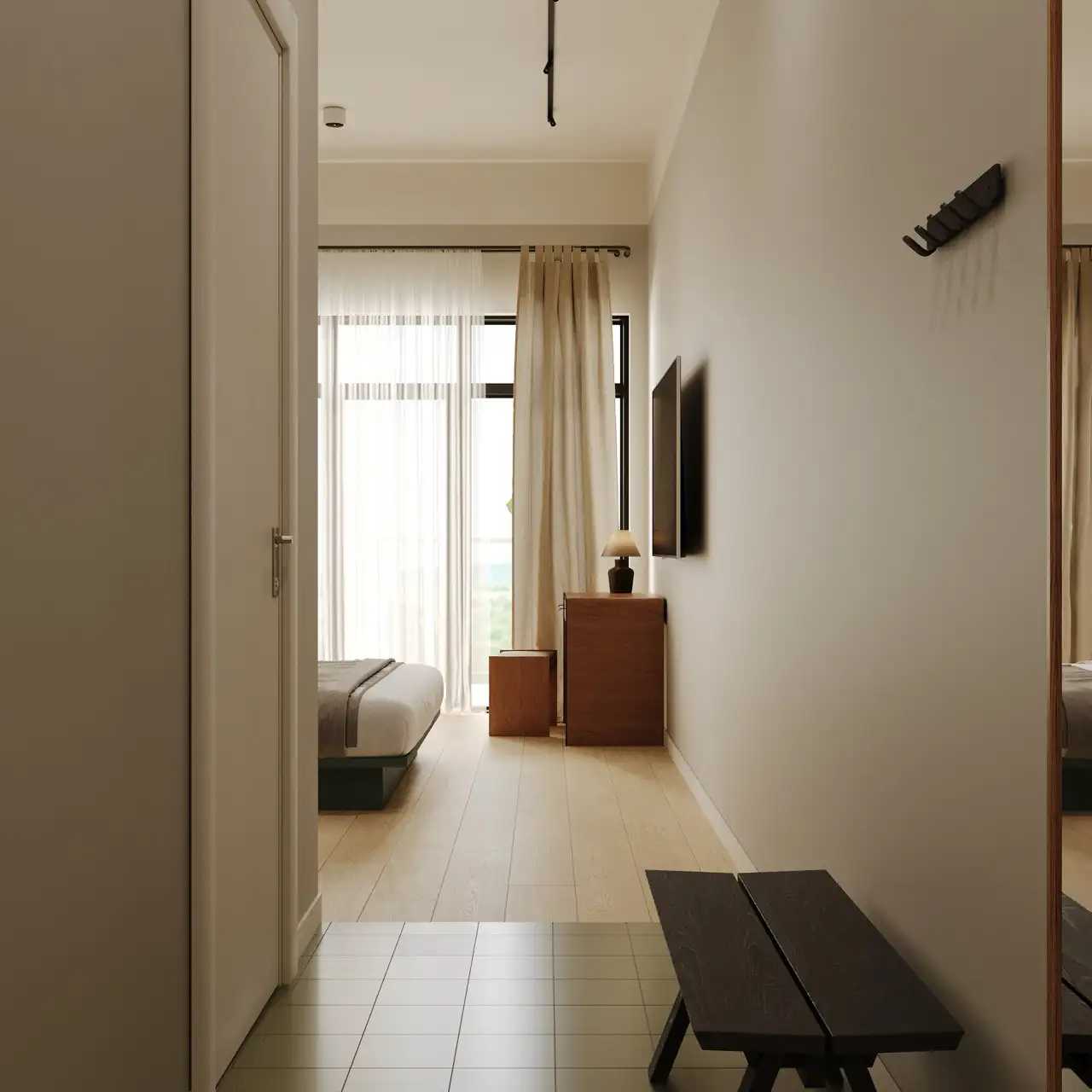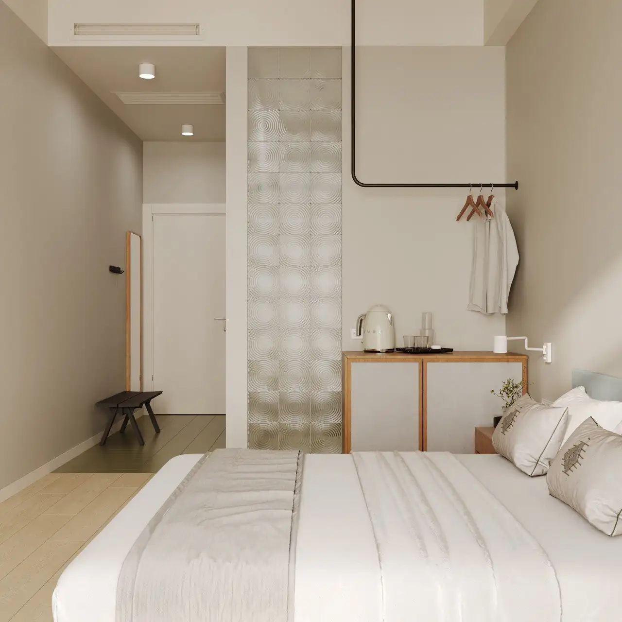 The intervention operates within an existing architectural shell. Rather than compete with the structural order, the interior strategy introduces soft counterpoints through layered textures, warm tones, and diffuse lighting conditions. Material selection prioritizes regional identity and tactility — including natural wood, raw textiles, clay finishes, and stone — to produce a subdued, grounded atmosphere.