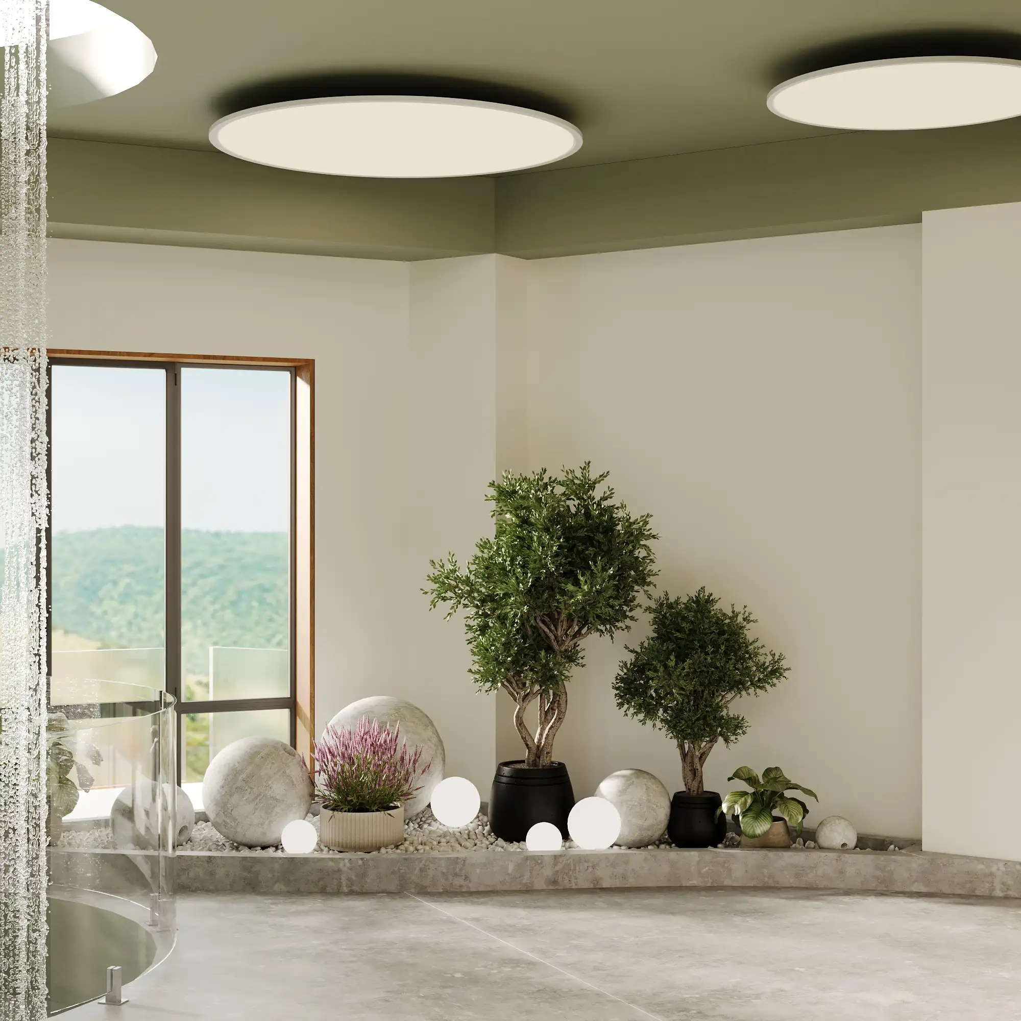 • Acoustic comfort is achieved through absorptive surfaces and spatial zoning.