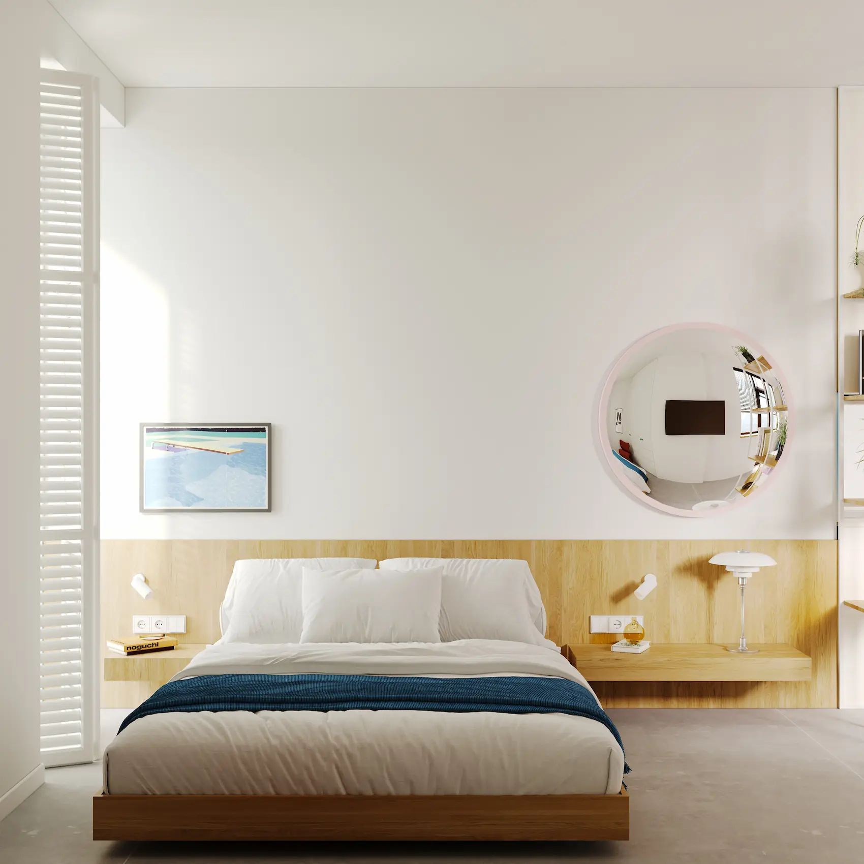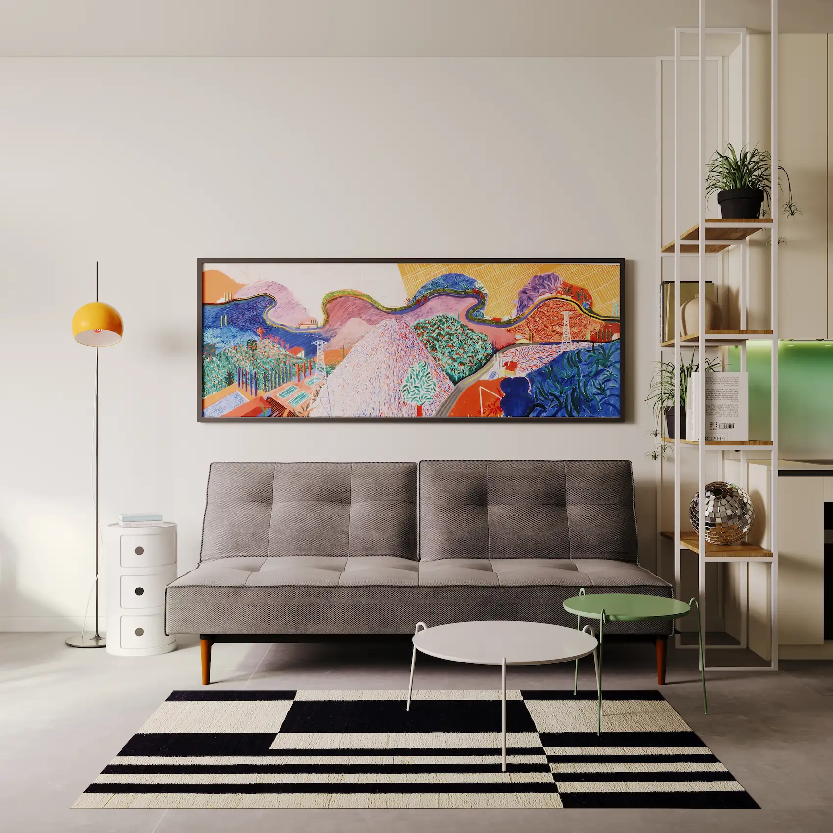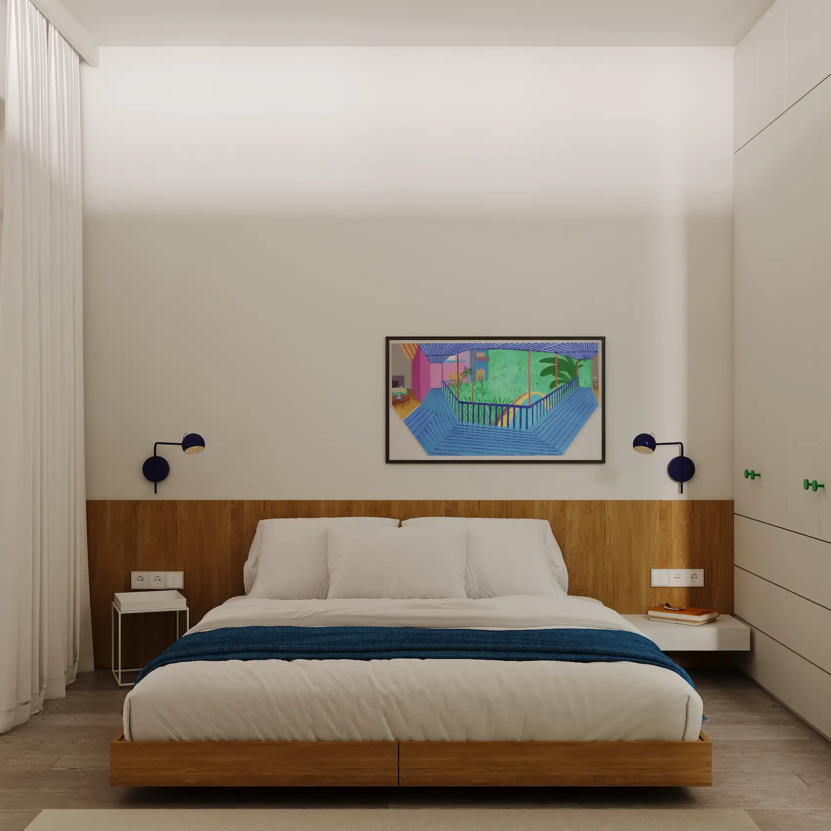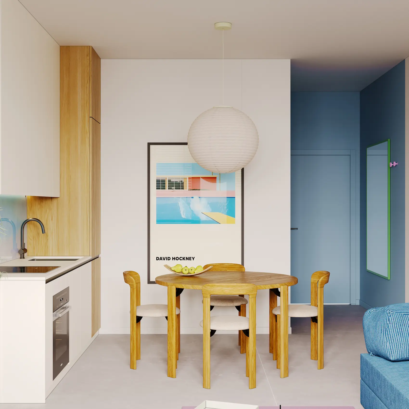 Visually, the interior design draws strong inspiration from the work of David Hockney. His use of color, rhythm, and spatial flattening is reinterpreted through a palette of clear chromatic contrasts, textural layering, and playful compositions. These visual references appear in accent walls, custom furniture detailing, and curated artwork integrated into the interiors.