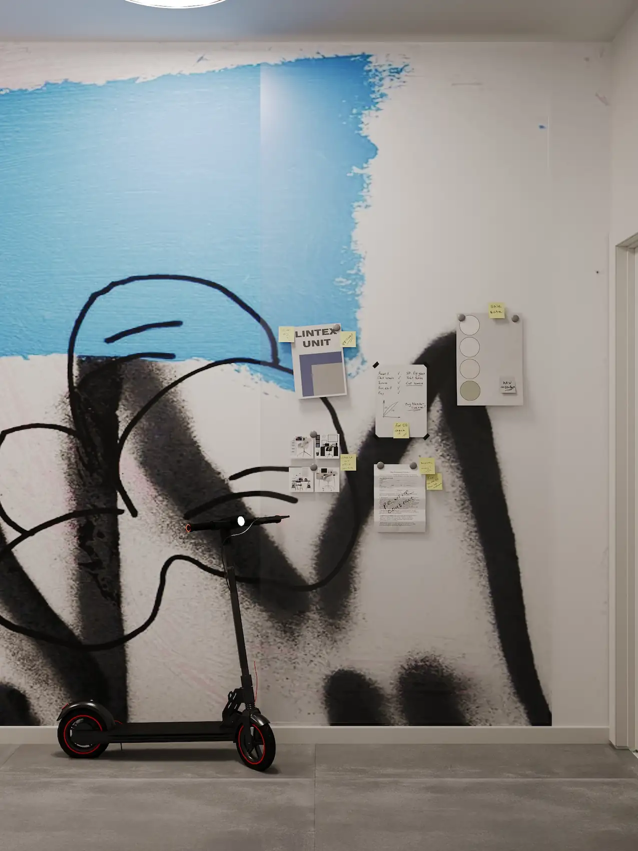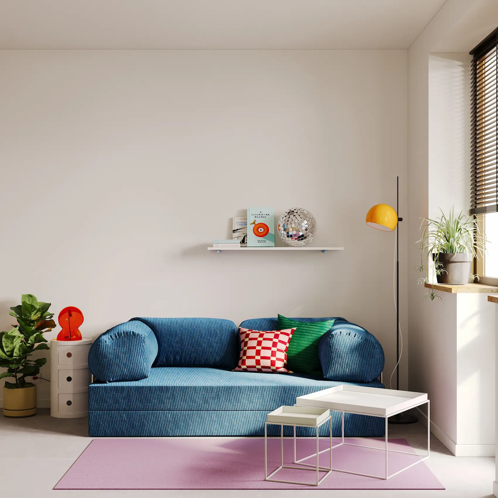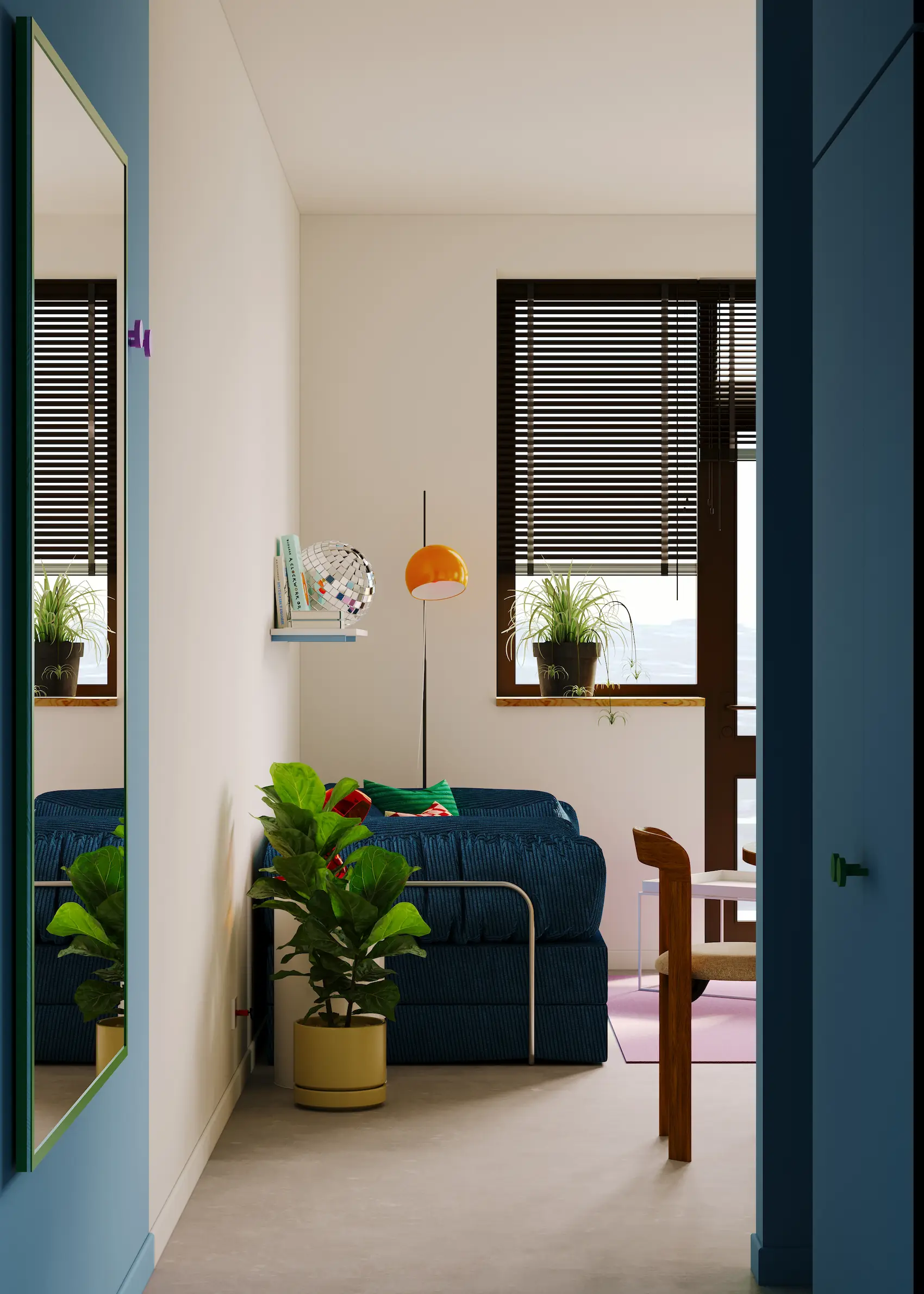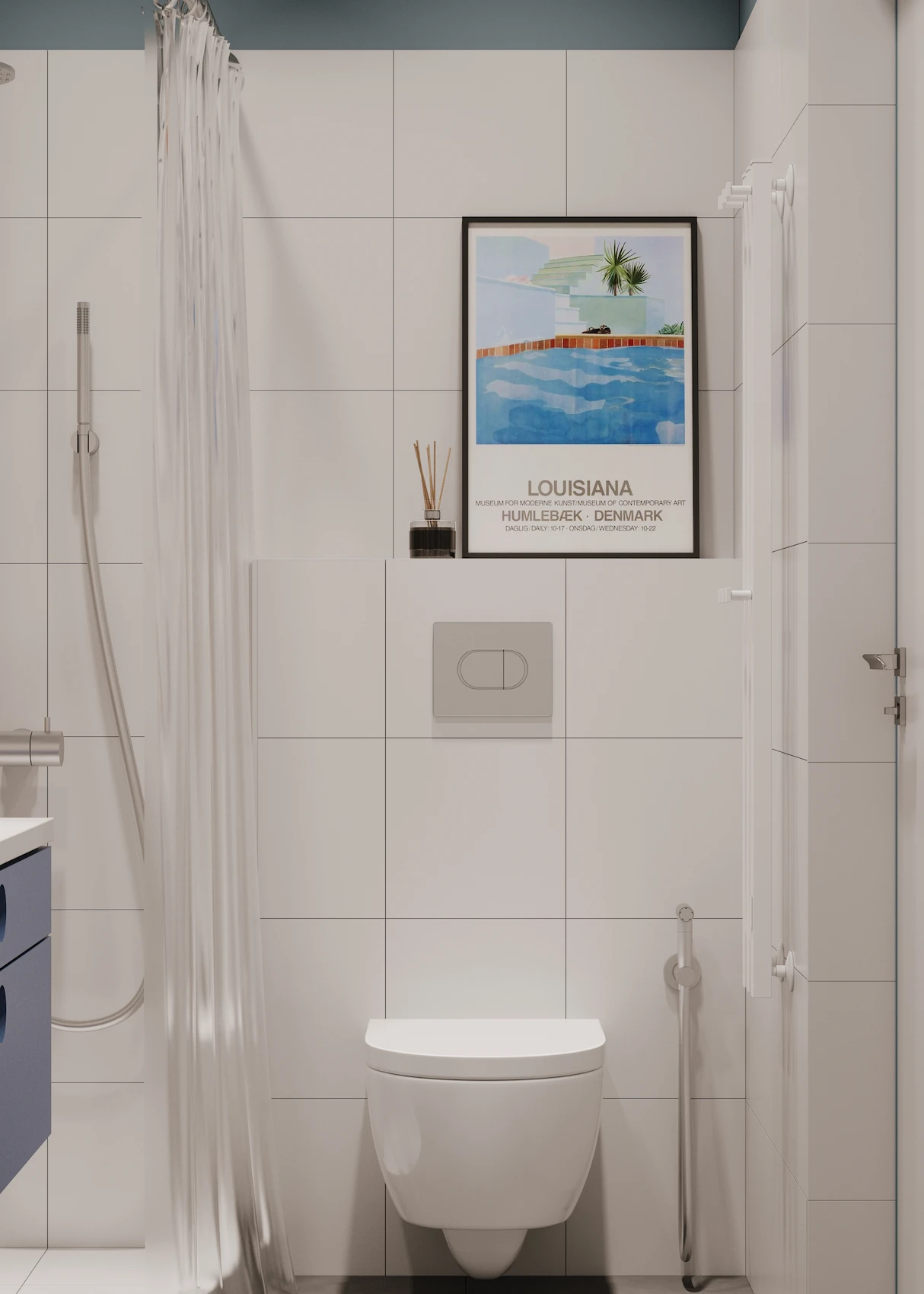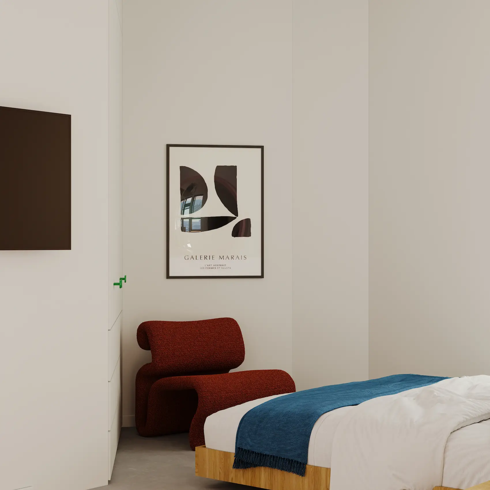 Visually, the interior design draws strong inspiration from the work of David Hockney. His use of color, rhythm, and spatial flattening is reinterpreted through a palette of clear chromatic contrasts, textural layering, and playful compositions. These visual references appear in accent walls, custom furniture detailing, and curated artwork integrated into the interiors.